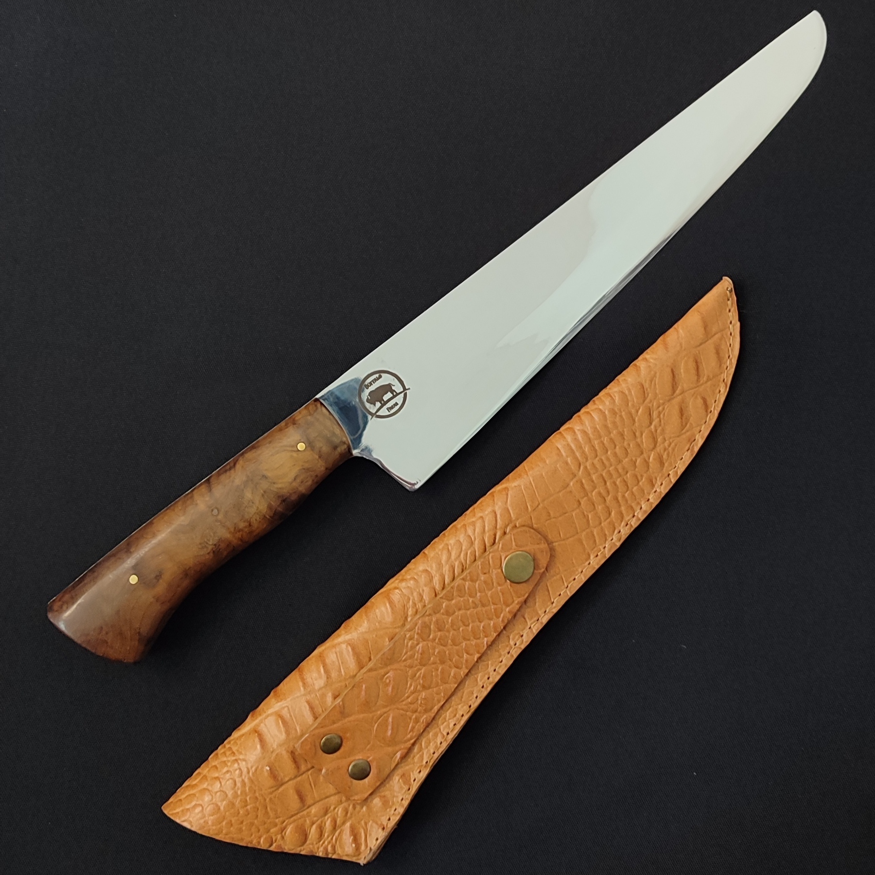 TRATA-SE DE UMA FACA ARTESANAL FEITA A MÃO, PODENDO APRESENTAR VARIAÇÃO NO BRILHO DA LAMINA, COR DA RESINA DO CABO, COR DA MADEIRA DO CABO, COR E FORMATO DA BAINHA - O TIPO DE AÇO, O PINGENTE DO CABO E O VAZADO DA LAMINA SEMPRE SERÃO IGUAIS AOS DA FOTO.