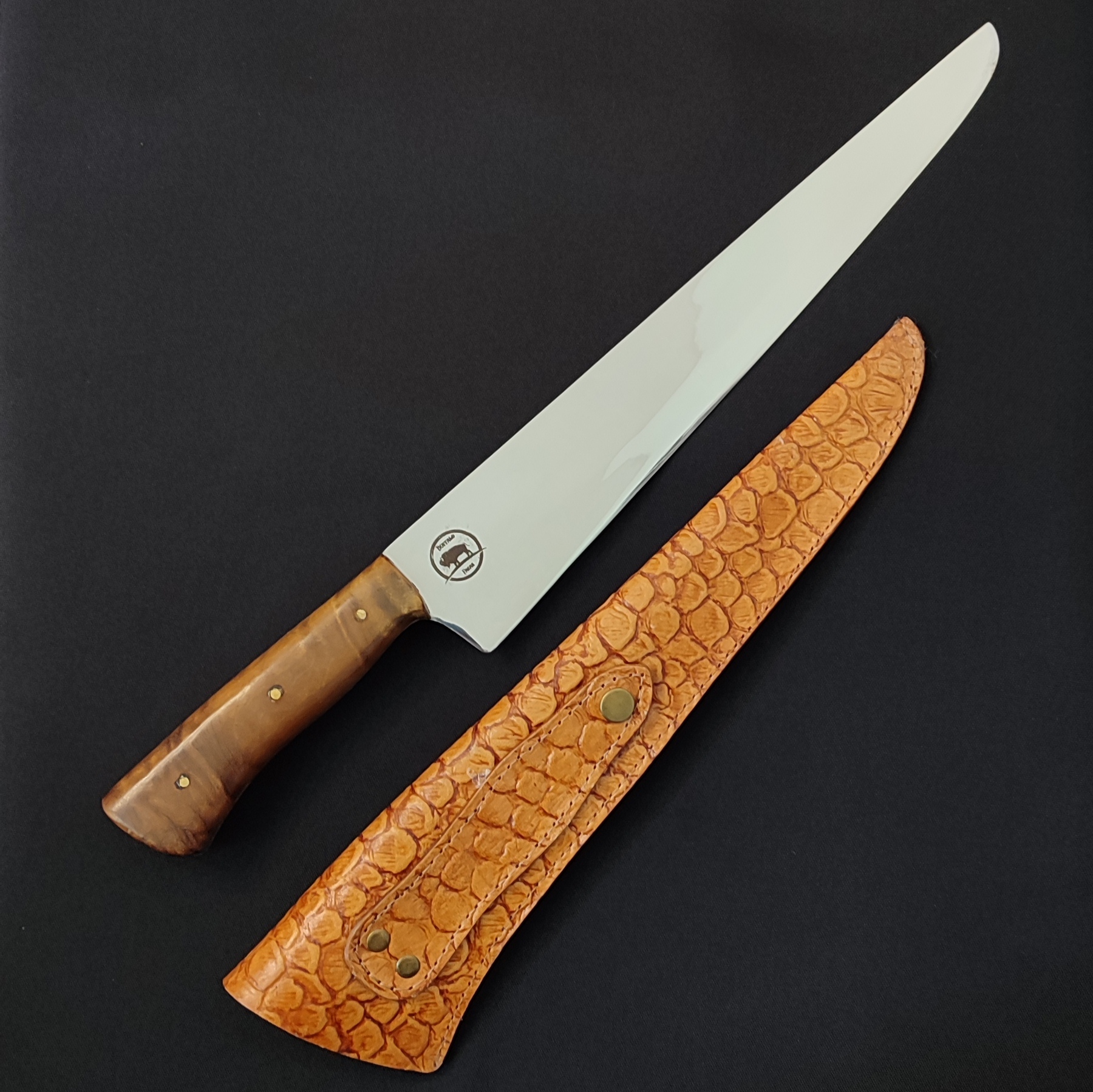 TRATA-SE DE UMA FACA ARTESANAL FEITA A MÃO, PODENDO APRESENTAR VARIAÇÃO NO BRILHO DA LAMINA, COR DA RESINA DO CABO, COR DA MADEIRA DO CABO, COR E FORMATO DA BAINHA - O TIPO DE AÇO, O PINGENTE DO CABO E O VAZADO DA LAMINA SEMPRE SERÃO IGUAIS AOS DA FOTO.