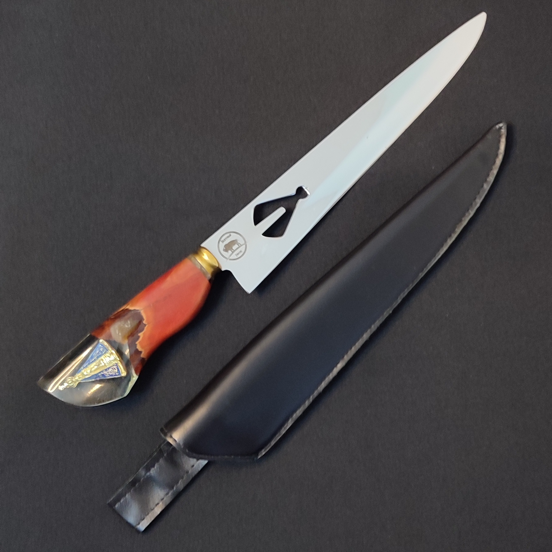 TRATA-SE DE UMA FACA ARTESANAL FEITA A MÃO, PODENDO APRESENTAR VARIAÇÃO NO BRILHO DA LAMINA, COR DA RESINA DO CABO, COR DA MADEIRA DO CABO, COR E FORMATO DA BAINHA - O TIPO DE AÇO, O PINGENTE DO CABO E O VAZADO DA LAMINA SEMPRE SERÃO IGUAIS AOS DA FOTO.