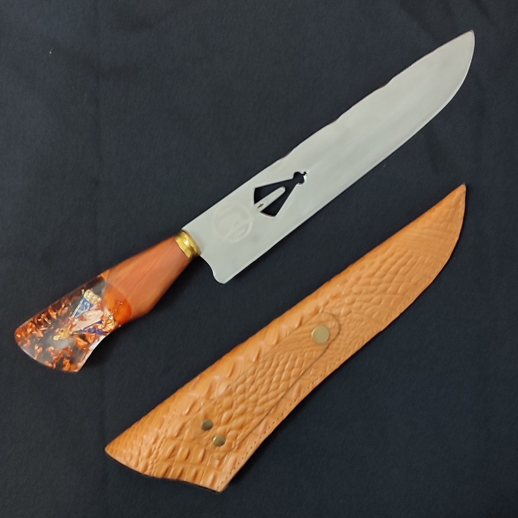 TRATA-SE DE UMA FACA ARTESANAL FEITA A MÃO, PODENDO APRESENTAR VARIAÇÃO NO BRILHO DA LAMINA, COR DA RESINA DO CABO, COR DA MADEIRA DO CABO, COR E FORMATO DA BAINHA - O TIPO DE AÇO, O PINGENTE DO CABO E O VAZADO DA LAMINA SEMPRE SERÃO IGUAIS AOS DA FOTO.